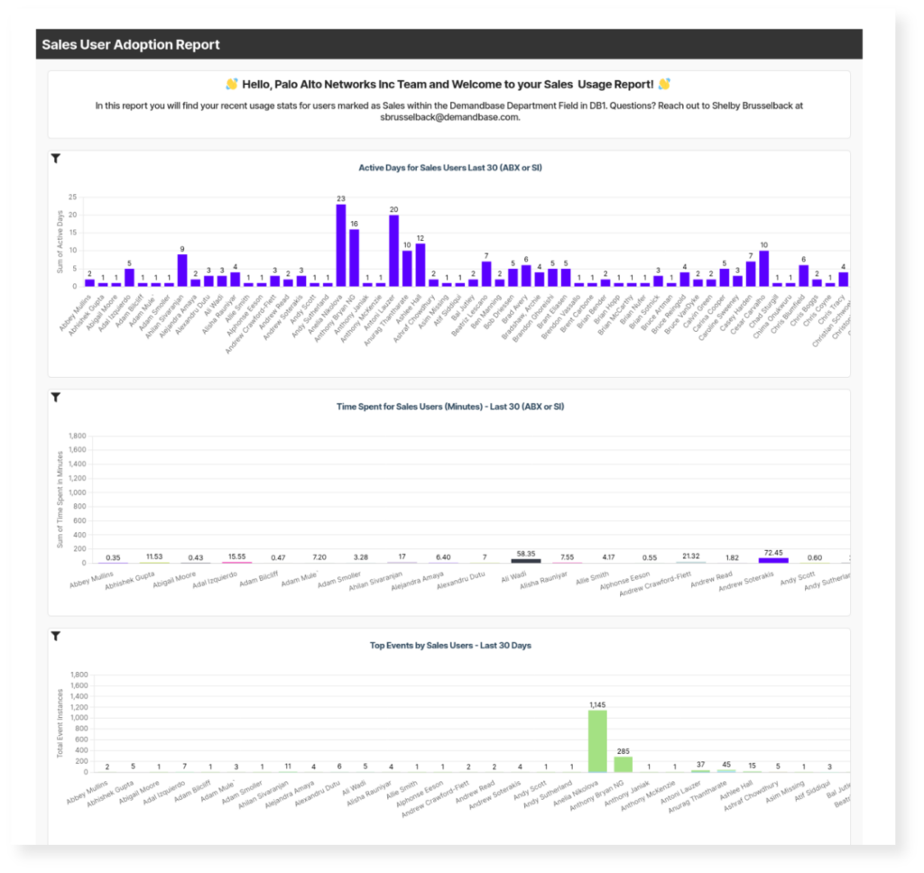 1. Sales User Adoption Report: helps you monitor which sellers are not actively using the Demandbase platform by showing you # of active days and time spent by each sales user.