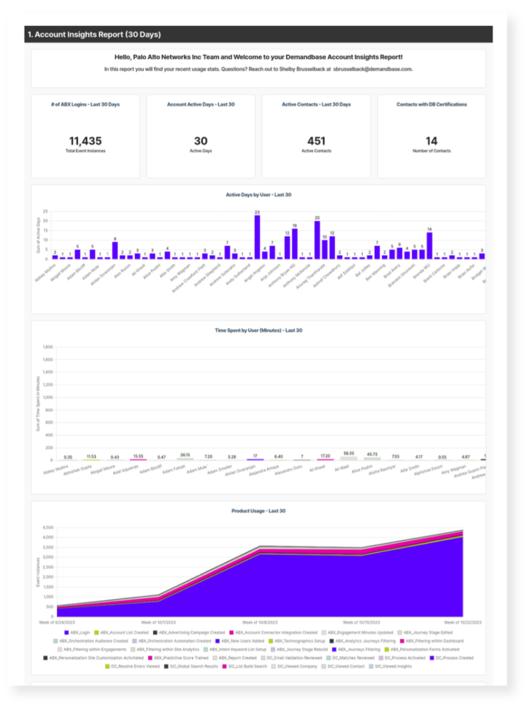2. Account Insight Report: helpful for organizations with a mix of users, including sales and marketing. It helps you monitor who is and isn’t actively using the Demandbase One platform. The report includes, for a specified period of time: