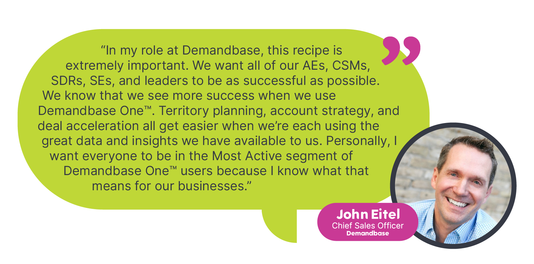 In today’s economic climate, showing direct ways to impact ROI is a requirement. This recipe highlights positive correlations between using Demandbase One™ and reps closing and winning more deals. We usually see power users of Demandbase One™ performing better than their peers who haven’t fully adopted the platform.